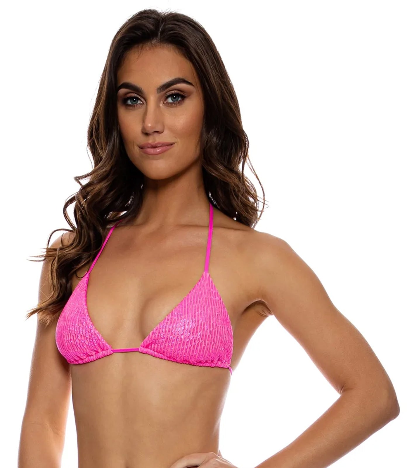 Model Front: Luli Fama Haut Top Wavy Ruched Bella Metallic Hot Pink